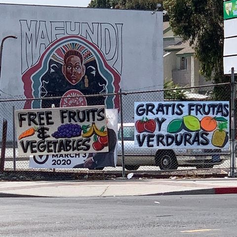 wzup wzup 💚 we packed n delivered 300+ produce boxes 4 the neighborhood yesterday. Trying to sponsor as much as I can but also pool resources 2 keep folks fed + include more grains, sets of masks, soap, hand sanitizer, sets of disposable gloves, etc in every box moving 4ward✨💿🌴🤟🏾❤️ Thank u thank u thank u @wattscommunitycore 4 everythang yall already do🤟🏾korina, monique💚, dr joy, pino, anthony, lil d, emmanuel, fawn, julia n my cuzzos aujané, baby d, bop bop 4 meeting up at as early as 4:30am to pick up food n assembly line style pack boxes in tha community center for 7/8 hrs. Thanks b and pinkus for helping 2 pass out boxes w/ us!✨If u have the means, think abt donating for next week’s June 6 drop. ✨Also! My lane isn’t food advocacy so if mission aligned folk out there wana collab and/or lend us sum advice, pls hit me up🙏🏾🙂 I see the info sheet included in each box functioning as the church bulletin/program that collages a lil bit of everything food/health/community data wise, co-authored by multiple voices (not just mine). Yesterday we did: Organic- Kale Bunch (312), Romaine Lettuce Bunch (312), Bell Pepper (300), Cucumbers (300), Butternut Squash (308), Tomato Roma (616), Potato Fingerling (616 bags), Blueberry 6oz Baskets (300), Oranges (600), Carrots (390), Cliantro (320), Mint (128), Rosemary (128), Broccoli Bunch (112), Pineapple (301), Bananas (144), Basil (144), Parsley Curly (112), Cabbage Heads Green (120), Apples Gala (600), Raspberries 6oz Baskets (108), Chives (112), Oregano (112), Avocado (300), Strawberries (304), Onion (300) Conventional - Mangos (308), Lemons (600), Limes (600), Beets (300), Garlic 1 pack w/ 5 each (165), Arugula (30 lbs), Collard Green Buns (300), Rice (300 lbs), Puerano beans (300 lbs), Corn Tortillas🌴 Tryna double up. Think abt donating if u can ⭐️ Thank u 2 airbody who donated already. Summaeverythang Community Center and I truly appreciate u💯 May 31, 2020